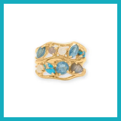 Exquisite 14 karat gold plated sterling silver earrings. Post features 5mm x 10mm irregular shape polygon blue glass with 7mm x 50mm 3-dimensional oblong green chalcedony drops. Full hanging length is 67mm.