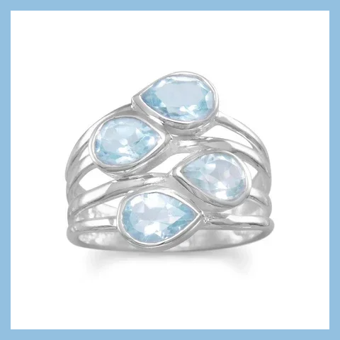 Sterling silver multi row ring with four pear blue topaz stones. The stones are approximately 5.5mm x 8mm. The ring is 17mm across the front and tapers to 2mm in the back.