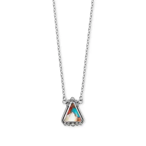Simply unique! 18" + 2" oxidized sterling silver necklace features a 10mm x 11mm tri shape spiny oyster and turquoise compressed stone pendant with rope and bead detailing. Necklace is finished with a spring ring closure.